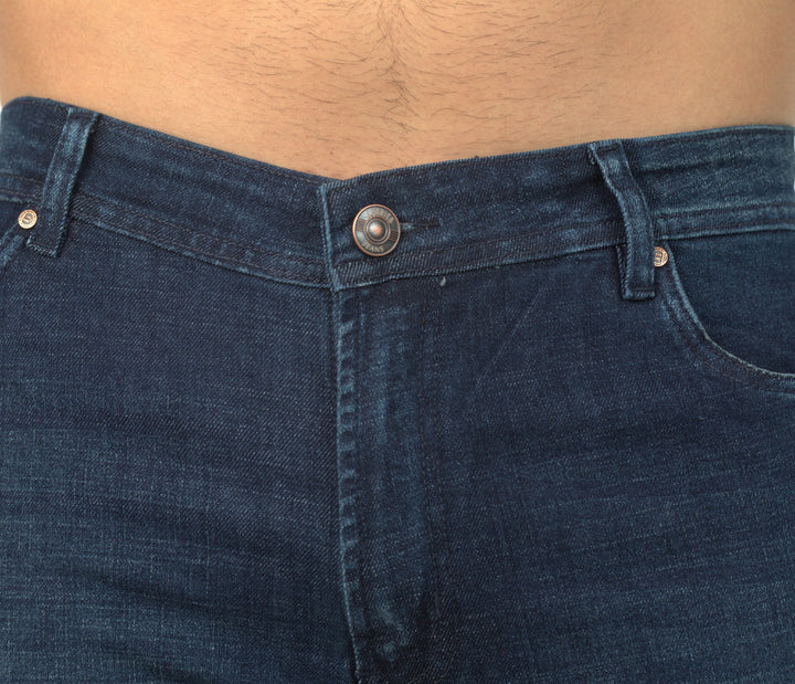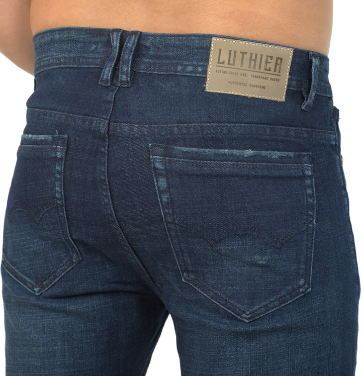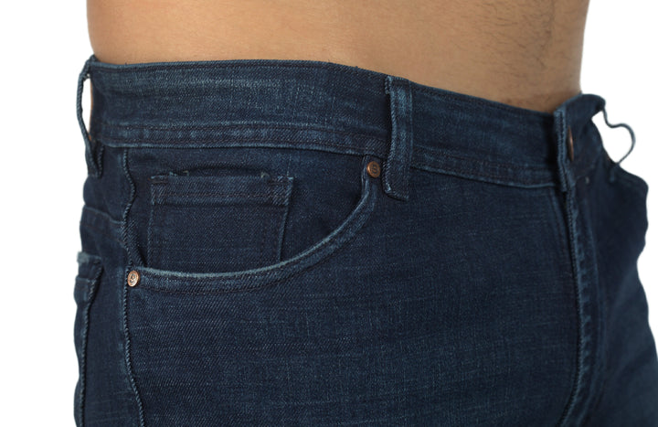 Jeans para hombre bota recta licrado clásico con desgaste color azul oscuro